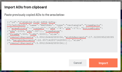 - Paste the copied AOI data into the text area shown and click Import to finish.