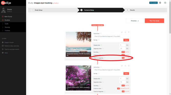 The "Finish on keystroke" option is a similar feature to the "finish on click" option. Both end item display (image or video) after a participant makes an action: